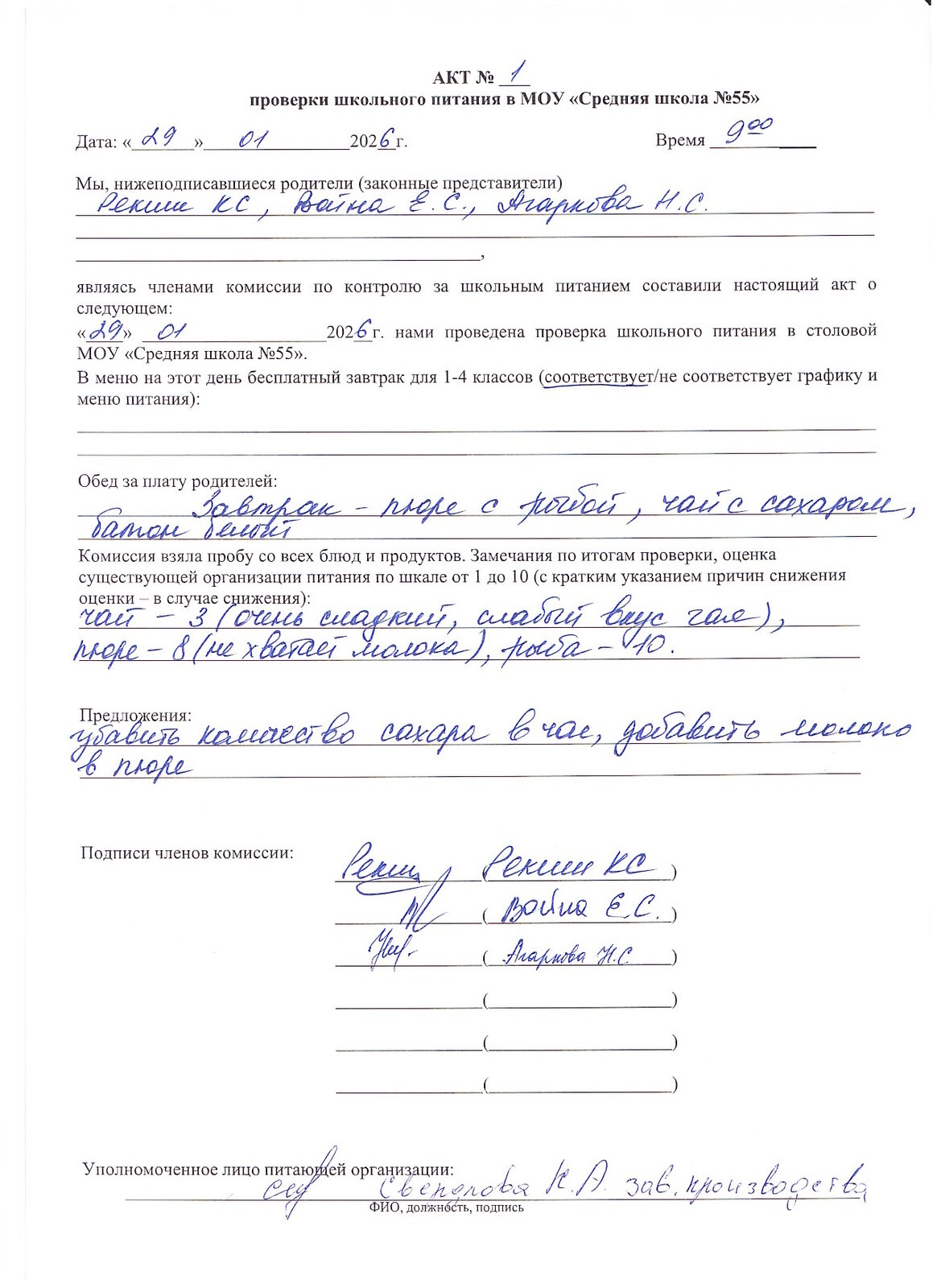МОУ «Средняя школа № 55» является ответственным лицом за организацию и качество горячего питания обучающихся. Важным фактором в обеспечении безопасности школьного питания является организация родительского контроля. Одними из «проверяющих» в данном случае выступают представители родительского комитета.