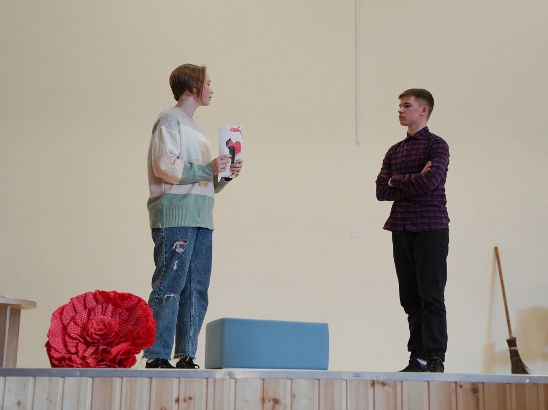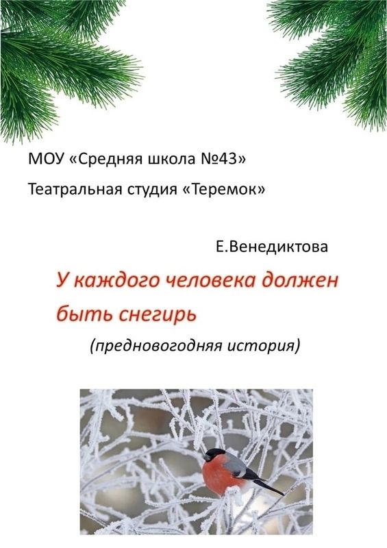 В честь такой замечательной даты школьная театральная студия «Теремок» МОУ СОШ № 43 под руководством Богатыревой Галины Васильевны подготовила отчётный спектакль по пьесе Е. Венедиктовой «У каждого человек должен быть снегирь». Это спектакль о взаимоотношении подростков, о поддержке и взаимопомощи друг другу. Вопросы, поднятые в спектакле, были очень близки зрителям спектакля - десятиклассникам нашей школы, родителям, учителям. Мы получили незабываемое удовольствие и насладились очень качественной игрой актеров.