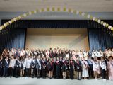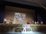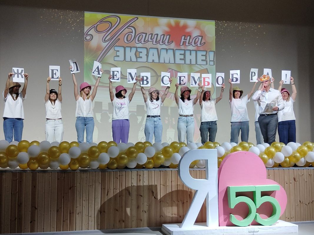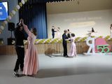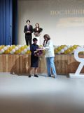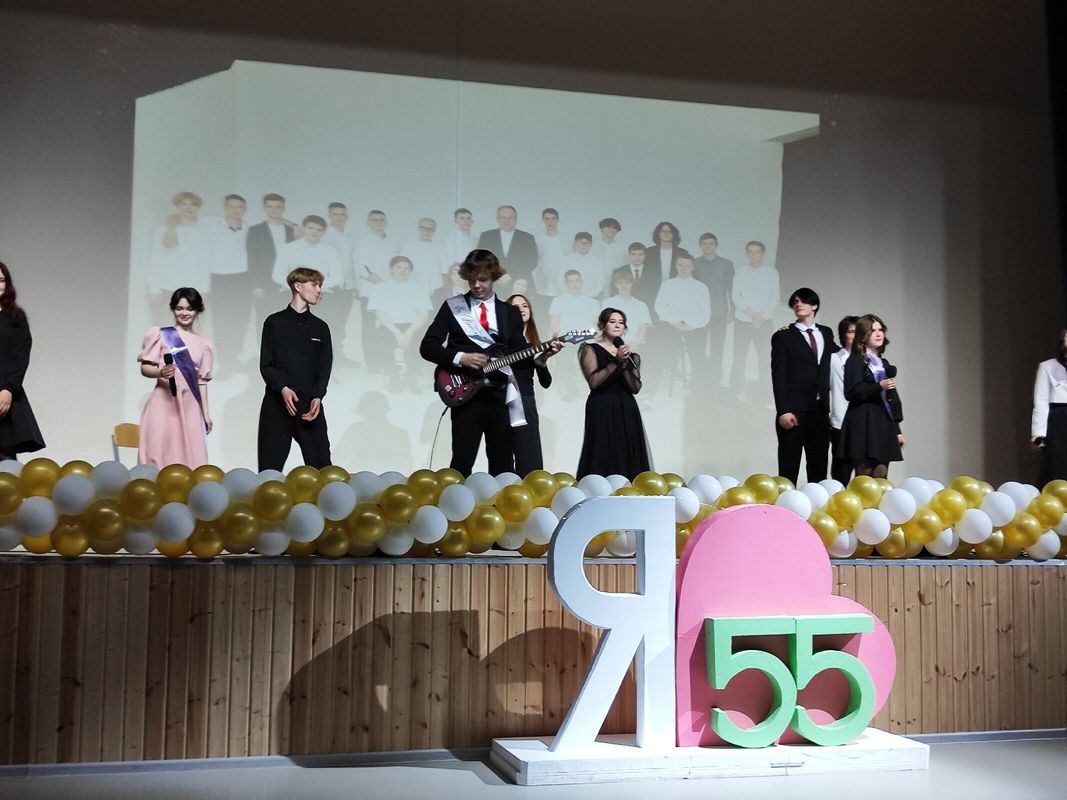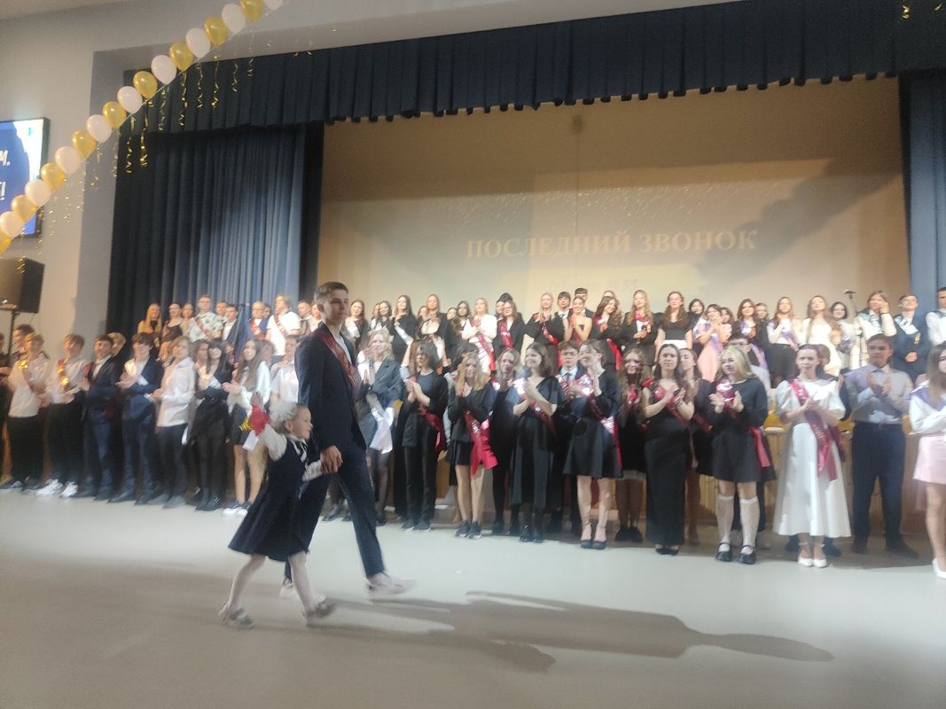 В этом году у нас пять девятых классов. Особенностью сегодняшнего праздника стало то, каждый класс не представлял свое выступление, а художественные сюжеты (сценки, вальс, песни) были исполнены сборными командами. Гимн школы, конечно, пели все вместе - и сцена, на которой стояли все девятые классы, и зал - родители и учителя.