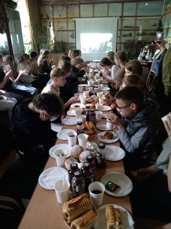 Ребята с удовольствием пили чай и морс, а также угощались вкусными пирогами от пекарни Bekker.
