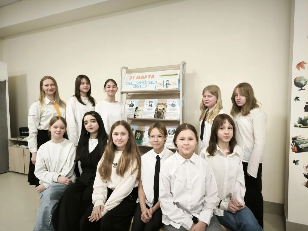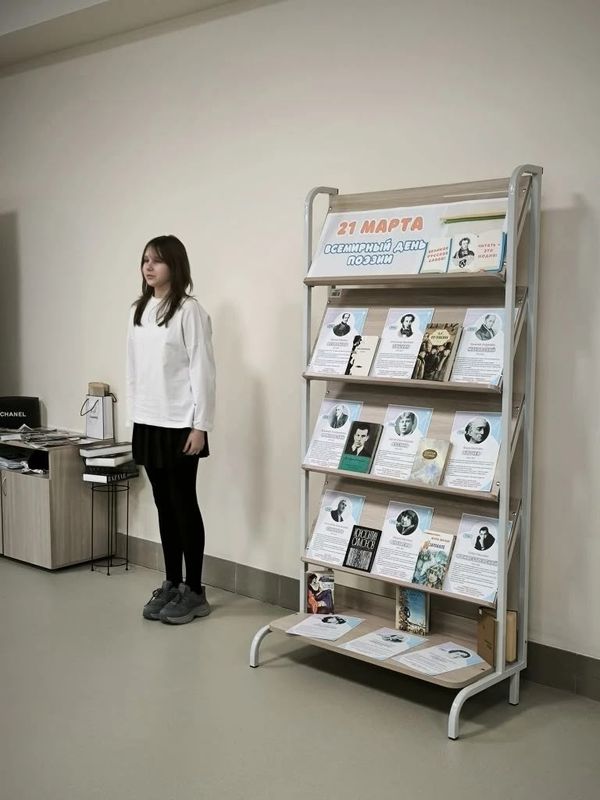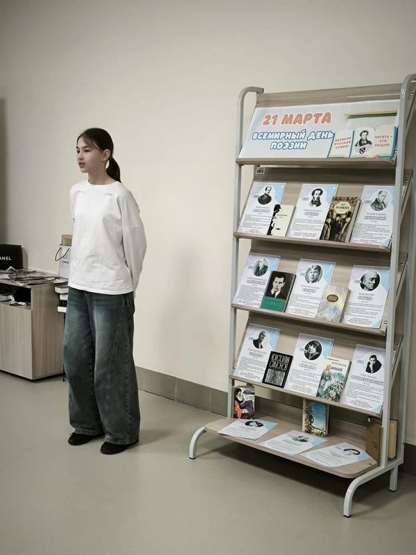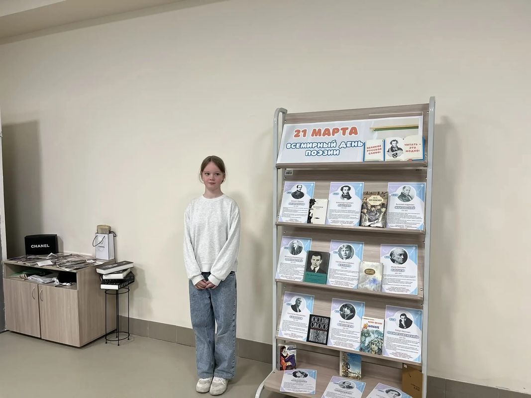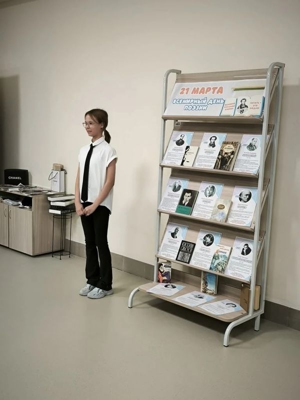 В преддверии праздника советник по воспитанию Наталья Юрьевна Петрова и библиотекарь Лидия Сергеевна Гульмалиева организовали выставку, на которой учащиеся 6Г класса читали стихи известных поэтов.