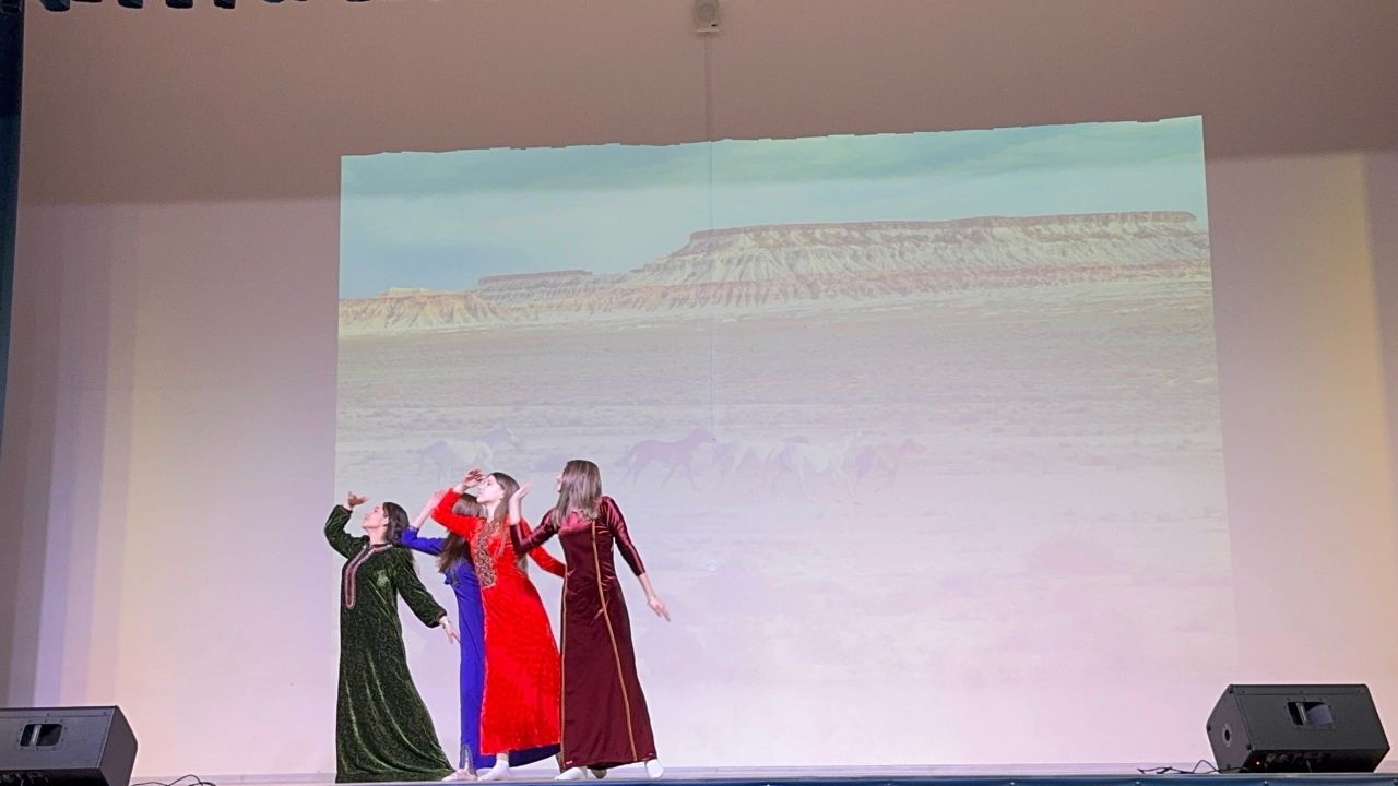 Самобытный Туркменистан встретил утонченным танцем «Серебрянный браслет». На сцене блистали ученицы 7В — Анна Климова, Илона Ильина, Маргарита Смирнова — и учитель биологии Махри Батыровна.