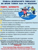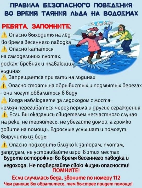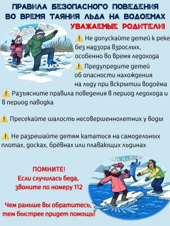 С наступлением весны лёд на водоёмах становится особенно опасным. Он теряет прочность, появляются трещины и промоины, которые не всегда заметны глазу. Выход на такой лёд может привести к трагедии. Пожалуйста, напомните детям: - гулять возле рек, озёр и прудов весной без взрослых категорически запрещено; - даже если лёд кажется крепким, он может проломиться в любой момент; - нельзя проверять прочность льда ударом ноги или прыгать по нему. Ваша задача — обеспечить безопасность ребёнка: - контролируйте, где и с кем гуляют ваши дети; - объясните им, чем опасен весенний лёд; - расскажите, что делать, если кто-то провалился под лёд (звать на помощь, звонить по номеру 112). Берегите своих детей! Их жизнь и здоровье — в ваших руках