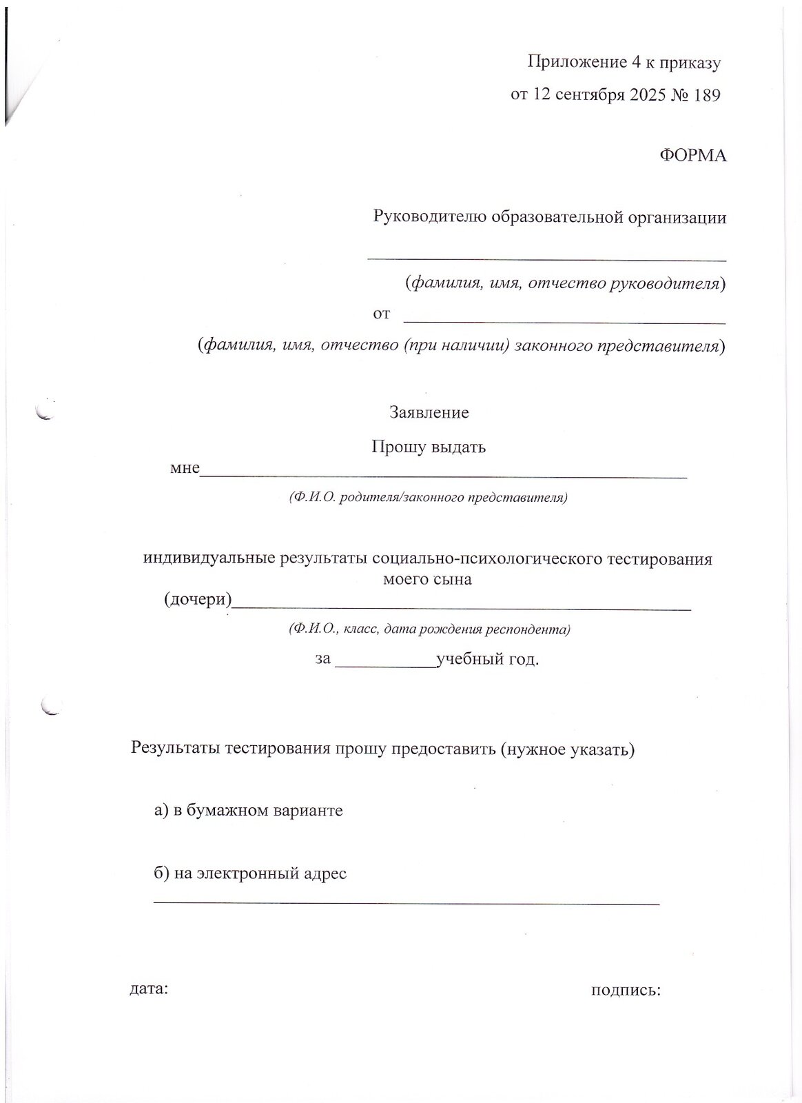 Файл (в формате Word) – заявление на получение результатов социально- психологического тестирования.