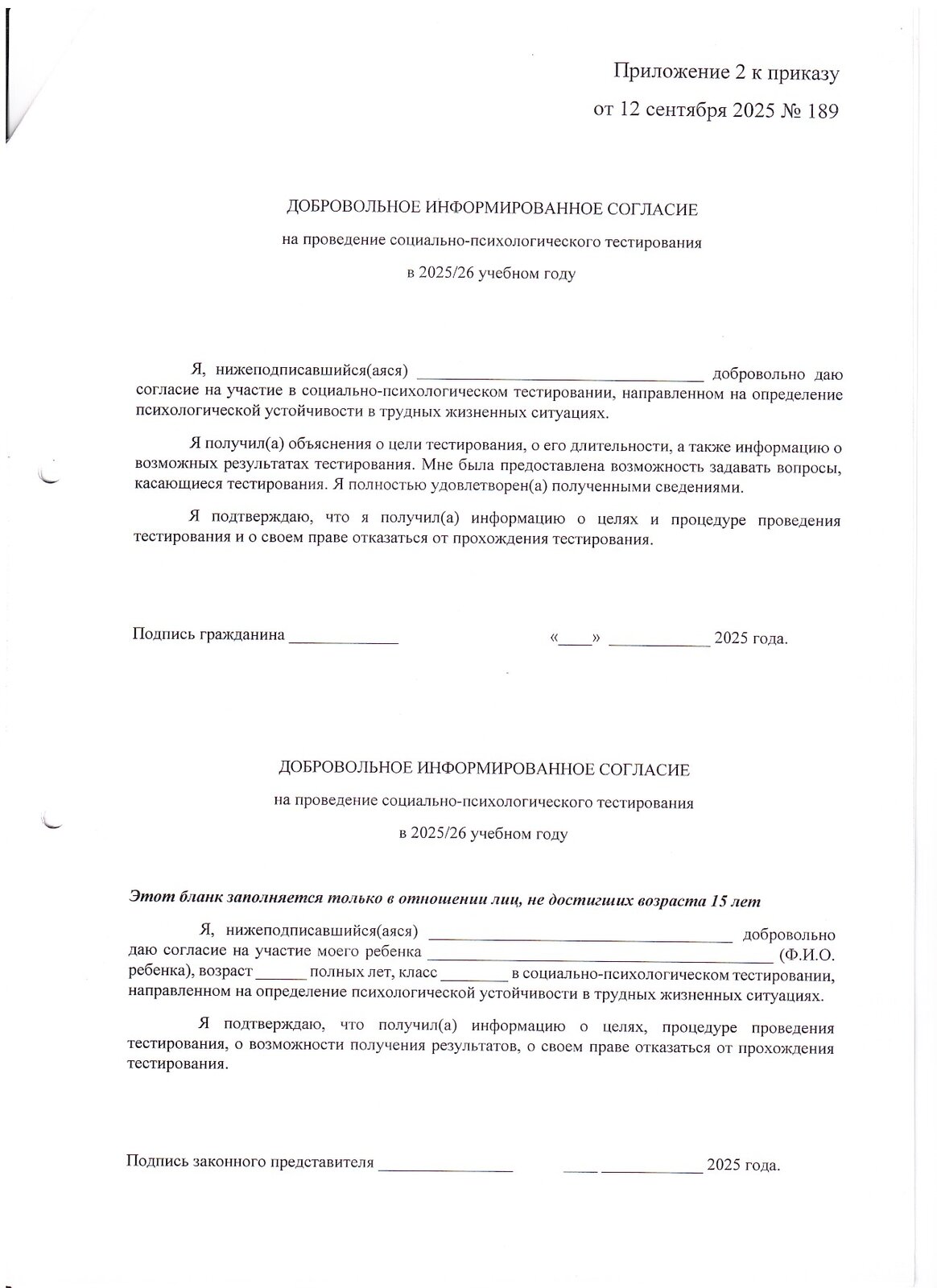 Информированные согласия на прохождение социально-психологического тестирования оформляются на классных часах и родительских собраниях либо в индивидуально порядке после получения респондентом или родителями (законными представителями) исчерпывающей информации о целях и порядке проведения СПТ.